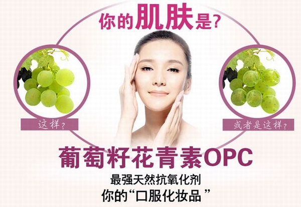 原花青素(葡萄籽提取物)是一种新型高效抗氧化剂,是目前为止所发现的最强效的自由基清除剂,具有非常强的体内活性。实验证明,OPC的抗自由基氧化能力是维生素E的50倍,维生素C的20倍,并吸收迅速完全,口服20分钟即可达到最高血液浓度,代谢半衰期达7小时之久。