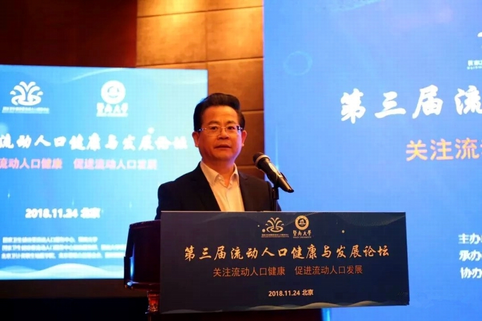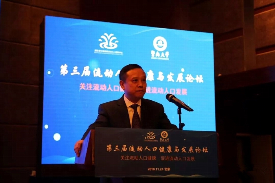 2018年11月24日,以“关注流动人口健康,促进流动人口发展”为主题的第三届“流动人口健康与发展论坛”在北京举行。本次论坛由国家卫生健康委流动人口服务中心、暨南大学联合主办。论坛旨在贯彻落实党的十九大精神和《“健康中国2030”规划纲要》,促进流动人口社会融合与家庭发展,助力健康中国建设。
